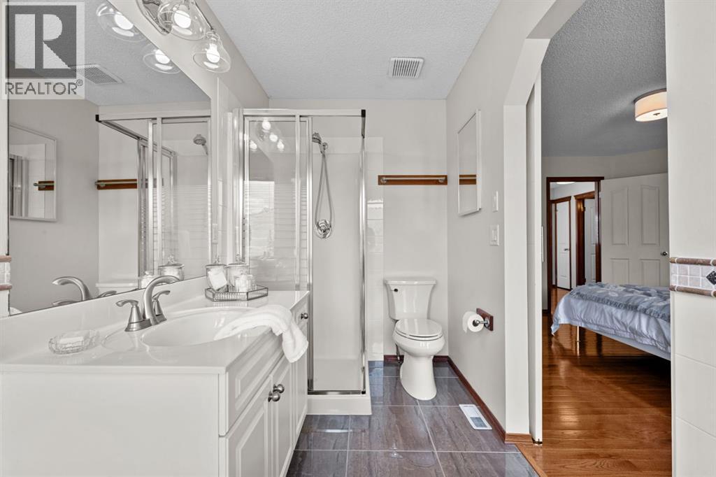 Welcome to this BEAUTIFUL HOME offering OVER 2000 sq. ft of finished living space and FIVE bedrooms, perfectly located in the sought after community of Gleneagles. Backing directly onto the FAIRWAYS OF THE GLENEAGLES GOLF COURSE. This property offers peaceful views, and a backyard retreat surrounded by beautifully landscaped grounds and no neighbours directly behind you. Step inside to a grand entrance with soaring VAULTED ceilings, creating an immediate sense of space and allowing an abundance of natural light to fill the home. The main floor features a formal living room and dining area perfect for entertaining family and friends. Towards the back of the home, you'll find a warm and inviting family room with a beautiful FIREPLACE, seamlessly connected to the kitchen. The kitchen features NEW STAINLESS STEEL APPLIANCES, ample storage and a convenient built-in desk space. The cozy kitchen nook offers the perfect vantage point to enjoy your morning coffee/tea while overlooking the meticulously maintained backyard oasis, featuring mature trees, garden boxes and a cozy fire pit seating area to enjoy those relaxing evenings. Upstairs the primary bedroom features a walk-in closet and a 5 piece ensuite bathroom along with two more spacious bedrooms and a full bathroom. From the second level. you can even enjoy the Breathtaking MOUNTAIN VIEWS. The Lower level offers a large sound proofed bedroom plus a newly upgraded 2nd bedroom/office space. Recent Upgrades include - a NEW ROOF (4 years), Hot Water Tank (3 years), Stainless Steel Appliances including washer/dryer (3 years), fireplace (1 year). Gleneagles offers quick access to Calgary while maintaining the quiet scenic charm that Cochrane is known for. Residents enjoy access to the towns extensive pathway system, with GLENBOW RANCH Provincial Park just minutes away, featuring breathtaking biking and walking trails overlooking the Bow River. Privacy and Tranquility await. Book your showing today and let this exceptional p roperty speak for itself. (id:54406)