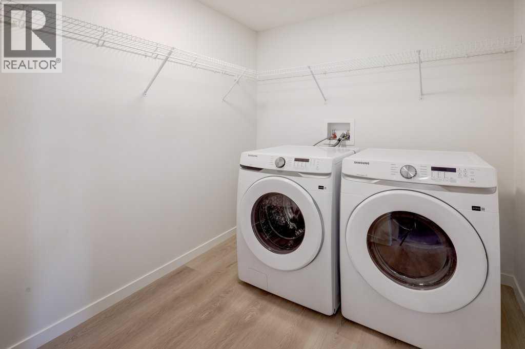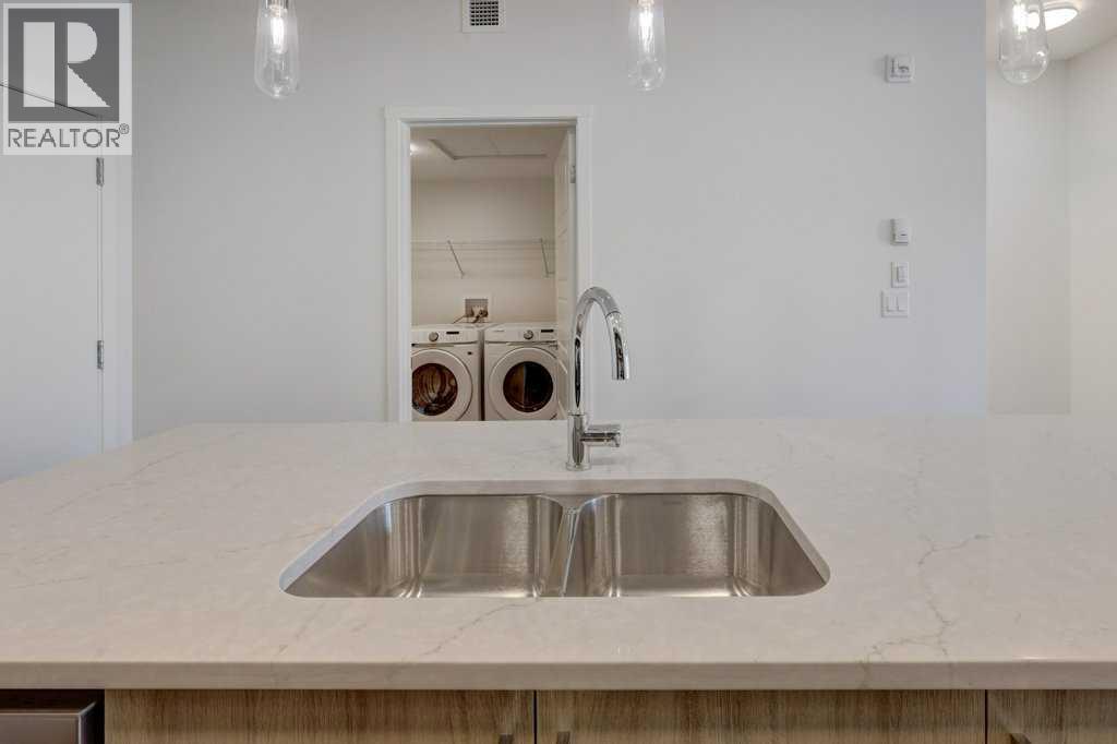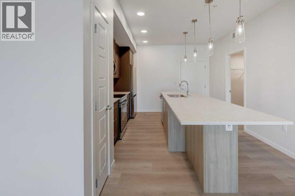 INTRODUCING GLACIER RIDGE, IN BEAUTIFUL NORTHWEST CALGARY. BUILT BY CEDARGLEN LIVING, WINNER OF THE Customer Insight BUILDER OF CHOICE AWARD, 6 YEARS RUNNING! BRAND NEW "GR04" unit with high-spec features. You will feel right at home in this well thought-out, 590.72 RMS sq.ft. 1 bed, 1 bath home with open plan, 9' ceilings, LVP flooring throughout (NO CARPET), Low E triple glazed windows, BBQ gas line on the patio, Fresh Air System (ERV), A/C rough-in, and so much more. The kitchen is spectacular with full height, two tone cabinets, quartz counters, upgraded bank of drawers for pots and pans, undermount sink, rough-in water line to the fridge and S/S appliances. The island is extensive with built in flush breakfast bar, which transitions into the spacious living area, perfect for entertaining. The spacious primary bedroom has a large bright window (triple pane windows) and sizeable walk-in closet. Right beside your bedroom is a 4pc bath with quartz counters, upgraded tiles to the ceiling, and undermount sink. Nearby is the spacious laundry/storage room, this is a must see (washer & dryer included). Highlights include: Hardie board siding, designer lighting package, sound reducing membrane to reduce sound transmission between floors, clear glass railing to balconies and 1 titled underground parking stall included. A once in a lifetime community in Northwest Calgary. Framed by views of the Rocky Mountains and distinguished by natural coulees that cross the land, Glacier Ridge offers a rare chance for families to live in a new community. PET FRIENDLY COMPLEX, IMMEDIATE POSSESSION AVAILABLE AND DON'T FORGET TO CHECK OUT THE VIRTUAL TOUR. (id:54406)