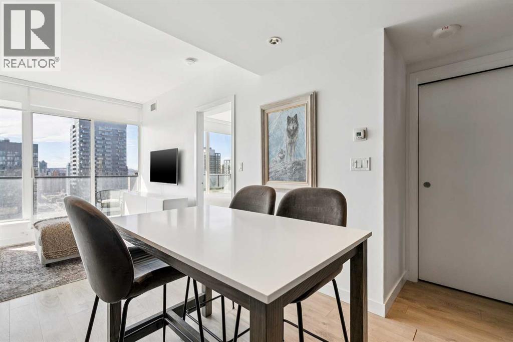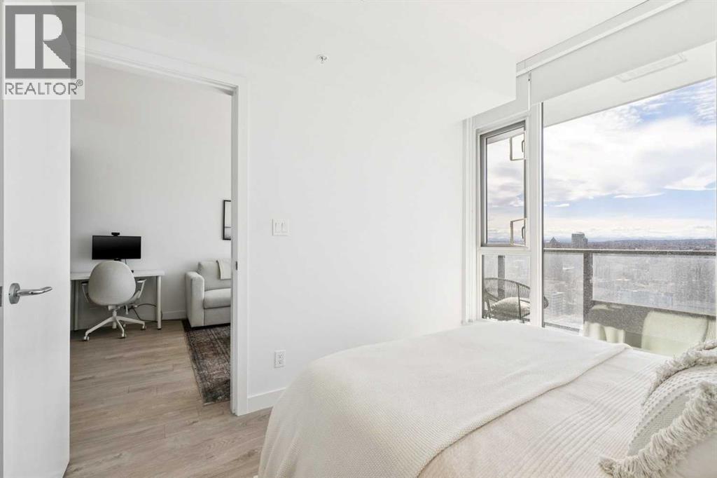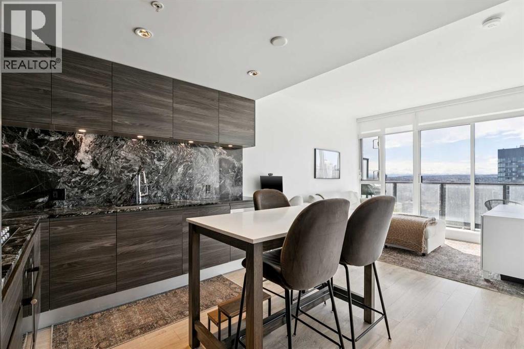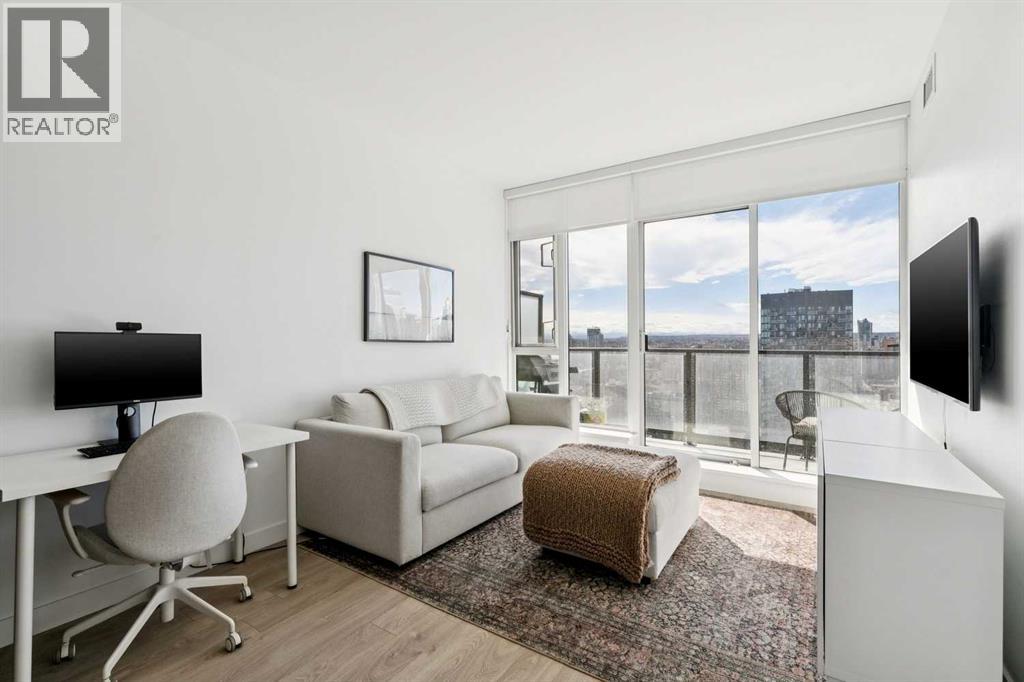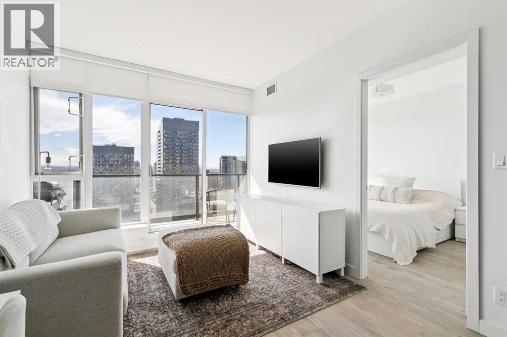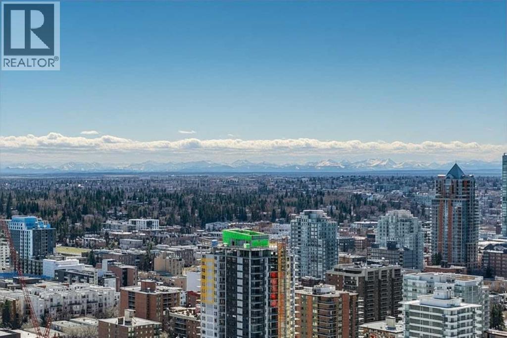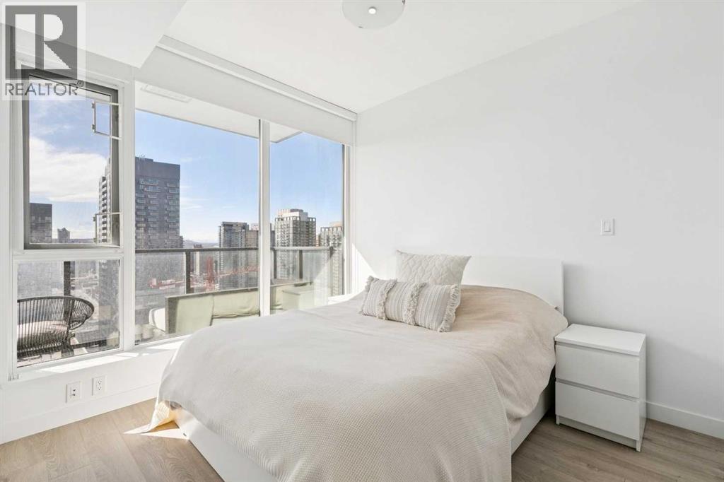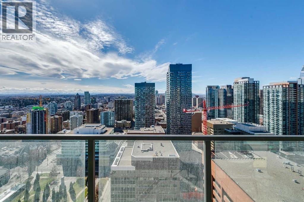 30th floor, WEST-FACING condo with MASSIVE BALCONY and UNDERGROUND parking. Perfectly positioned to capture panoramic mountain views, the downtown skyline, and stunning sunsets. Located in the heart of the Beltline, surrounded by many of Calgary's best shops, restaurants, and Memorial Park. Inside, the home blends modern design with everyday comfort. Floor-to-ceiling windows flood the space with natural light, while high ceilings and wood laminate flooring create an open, airy feel. The sleek kitchen features Italian Armony Cucine cabinetry, stone slab countertops and backsplash, a gas range, integrated panel refrigerator, custom island, and premium finishes throughout. The spacious bedroom includes a walk-in closet, complemented by a well-appointed bathroom with a large tub/shower combo. Additional features include built-in shades, air conditioning, in-suite laundry, underground titled parking, and an extra storage locker.The modern style and design of Park Point and its amenities allow for the perfect urban lifestyle. Park Point offers 24/7 concierge and security, a fully equipped fitness centre, yoga studio, sauna and steam room, social lounge with kitchen, party room, outdoor BBQ and lounge area, guest suite, underground visitor parking, secure bike storage, and a car/pet wash station.Opportunities like this don’t come up often—book your showing today before it’s gone! (id:54406)