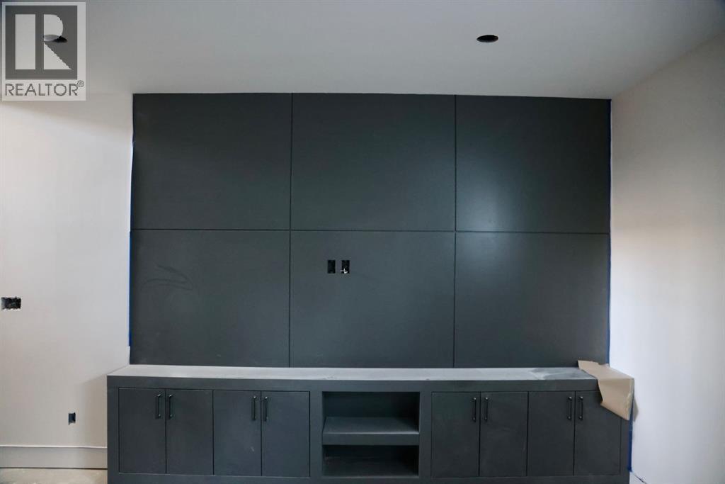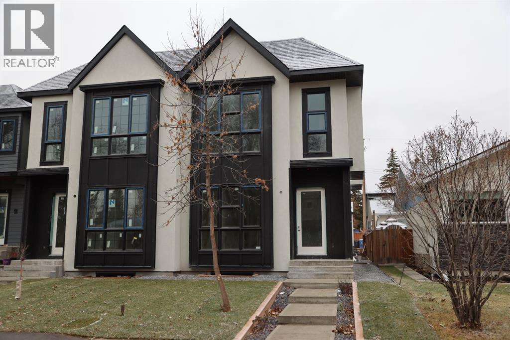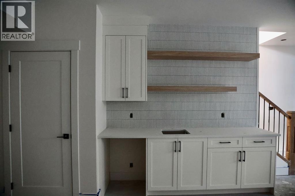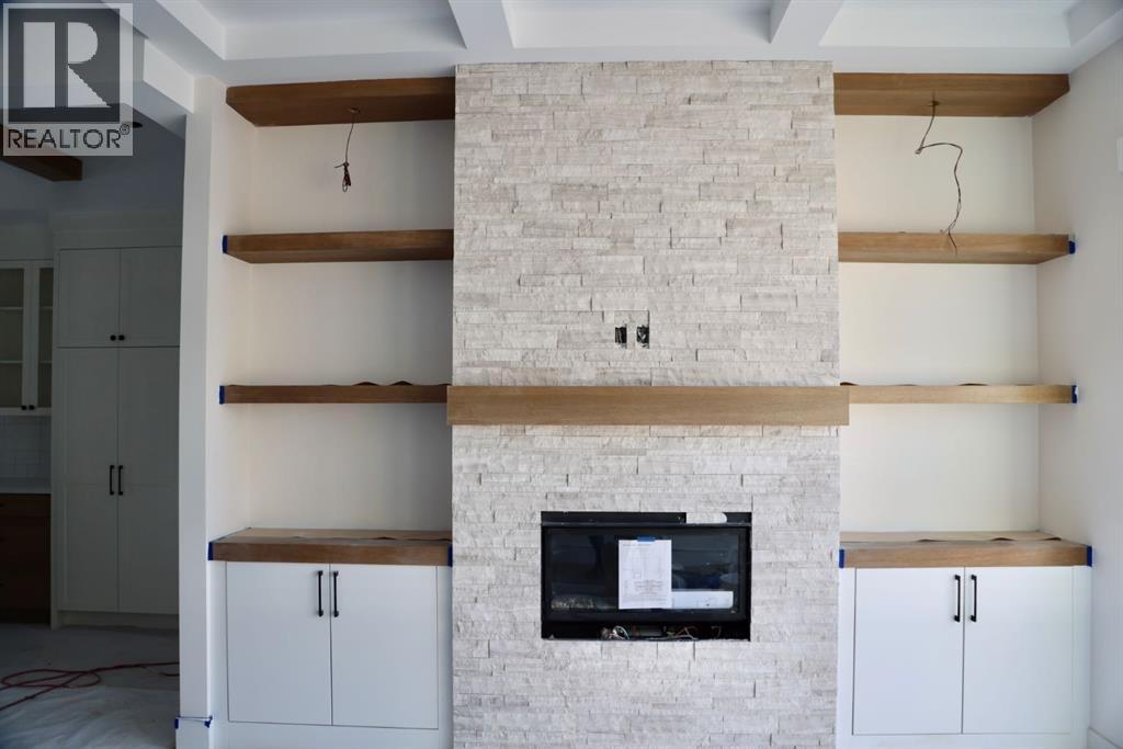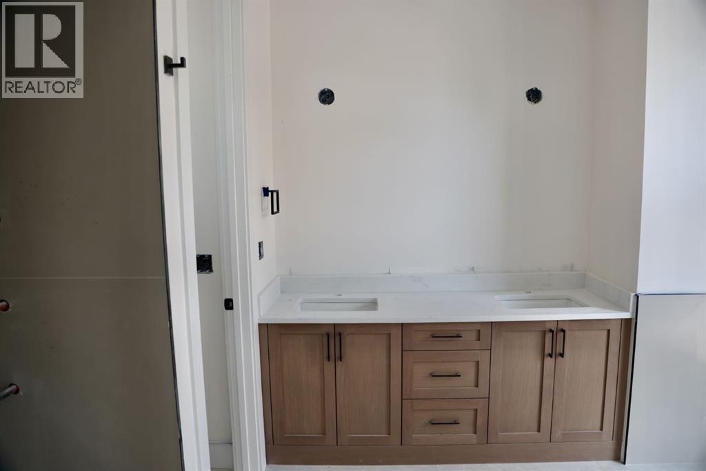 Timeless design, modern comfort, and everyday function come together on a quiet tree-lined street in this brand-new SEMI-DETACHED home in GLENBROOK. With expansive windows, warm natural materials, and elevated finishes throughout, it’s crafted for family living in one of Calgary’s most established neighbourhoods.Step in from the covered entry to a bright foyer with sightlines across the open main floor, where light oak hardwood carries seamlessly through the principal rooms. The front dining room is anchored by a custom feature wall, setting the tone for the thoughtful millwork found throughout. At the heart of the home, the chef-inspired kitchen blends beauty with purpose—two full pantries, crisp white uppers over matching oak lowers, a striking waterfall quartz island, and professional KitchenAid appliances including a flat gas cooktop, built-in wall oven, and French-door fridge. Clean lines, elegant lighting, and generous prep space make this a true culinary hub.The floorplan flows naturally into the inviting living room, where custom built-ins frame a cozy gas fireplace, creating the perfect space to unwind or gather with friends. Large windows and an 8’ sliding patio door pull in west light and open directly to the backyard for easy indoor/outdoor living. A well-designed mudroom with built-ins keeps everyday essentials organized, while an elevated powder room provides privacy and convenience through a hidden door.Upstairs, retreat to the serene primary suite, where vaulted ceilings lift the space and morning sun pours through oversized windows. The ensuite reads like a private spa, offering a massive walk-in shower with body jets, double sinks, a deep free-standing soaker tub, and beautifully curated tile throughout. A custom walk-in closet completes the sanctuary. Two additional bedrooms sit down the hall, each with their own custom cabinetry, and a thoughtfully placed built-in desk creates the perfect homework zone or dedicated home office. A spacious laun dry room with quartz countertop, sink, and extra storage ensures the second floor is as practical as it is comfortable.The lower level flexes effortlessly with family life—an expansive family room with custom built-in TV wall, a generous flex/rec area with a full wet bar, plus an additional bedroom and full bath, ideal for guests, teens, or extended family.Step outside to a sun-soaked west-facing backyard, complete with a large rear deck and BBQ gas line, ready for late summer evenings and weekend gatherings. A double garage and a striking exterior finished in stucco and Hardie-board siding complete this exceptional property.Set in the heart of Glenbrook, this home places you close to schools, parks, playgrounds, shopping, transit, and major routes—offering the perfect blend of community charm & everyday convenience.A refined, functional, and beautifully built home—crafted for real life, designed to be lived in, & ready to enjoy. More photos to follow, as cabinets and flooring have now been installed. (id:54406)