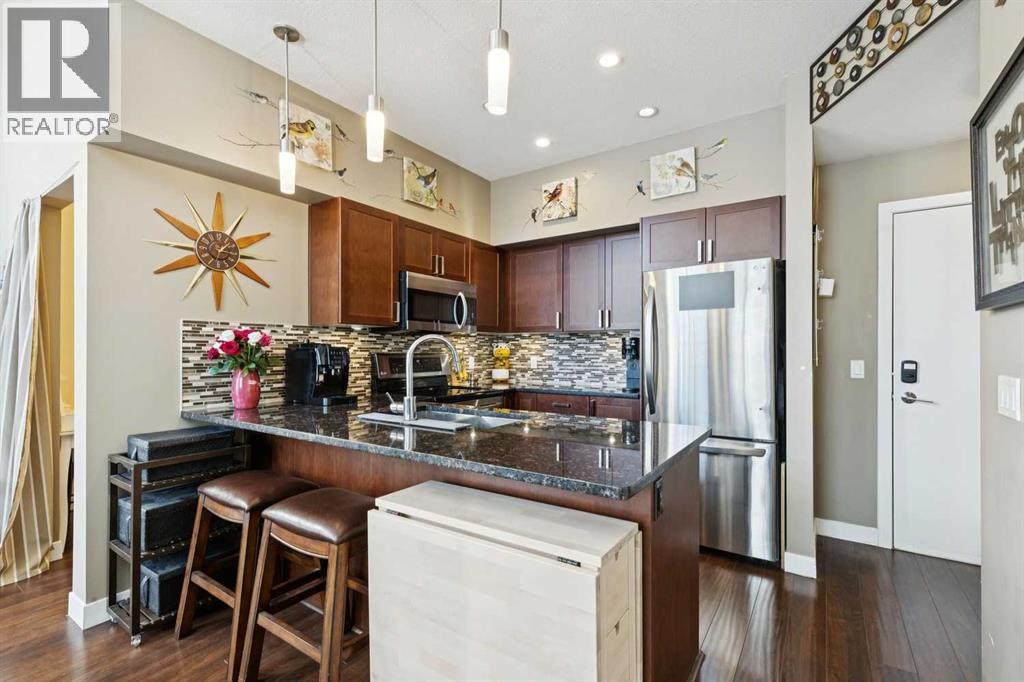 Welcome to Stonecroft Highland Park. Situated on the top floor this single bedroom + den unit features 15ft vaulted ceilings providing a ton of natural light - rare for apartment style condos. Combined with large windows, the height and design create an open, light-filled space that immediately stands out. The functional layout offers thoughtfully designed living throughout. The chefs style kitchen provides excellent cabinet and counter space, complete with granite countertops, stainless steel appliances, and a functional breakfast bar. The primary bedroom is spacious and bright, with large windows and his and hers closets for added storage and organization. A generous 4 piece bathroom and versatile den offer flexibility for a home office, guest area, or additional living space. Additional features include a stacked in-suite washer and dryer, private patio, heated underground parking stall, and separate storage locker. Overall this unit shows pride of ownership throughout! Condo fees include heat and water. The building is well cared for and offers a social room and lots of covered visitor parking. Located on a quiet street next to an off-leash dog park, it provides convenient access to Deerfoot Trail, Centre Street, nearby shops, amenities, and downtown by public transit. An excellent opportunity for comfortable living in a desirable and convenient location. Top floor units in this building don't last long so be sure to schedule your tour before its gone! (id:54406)