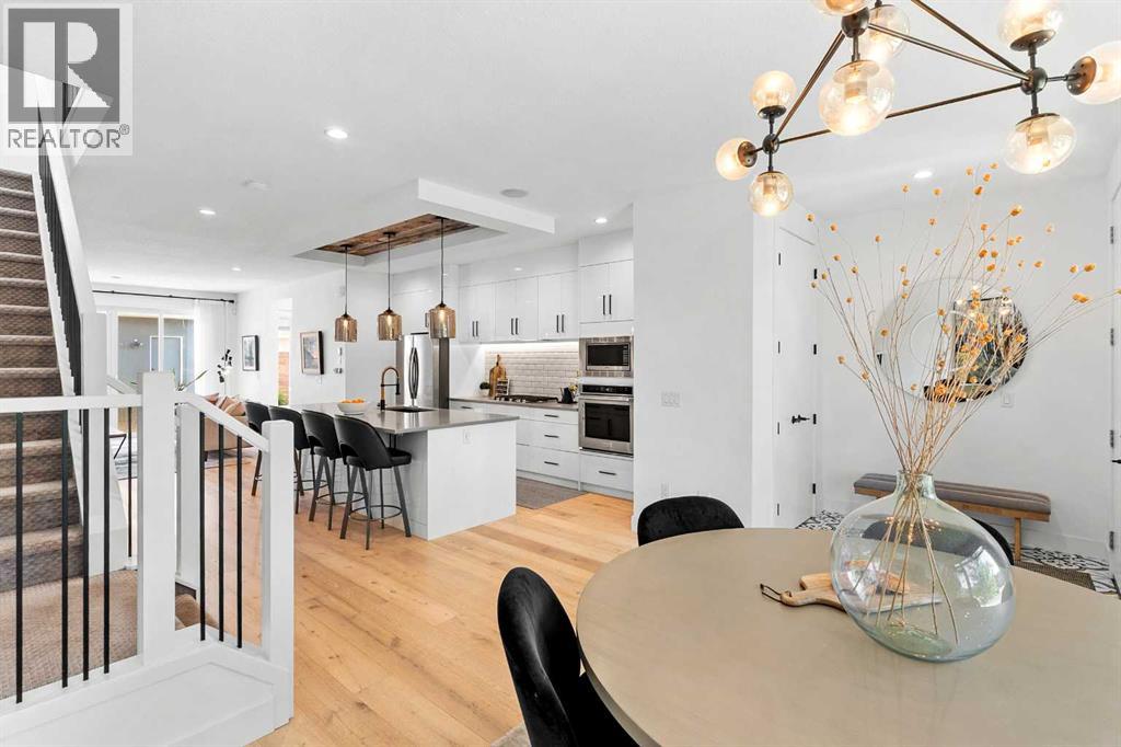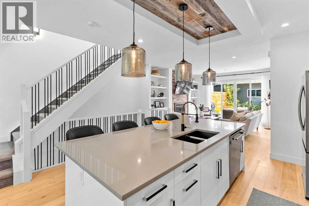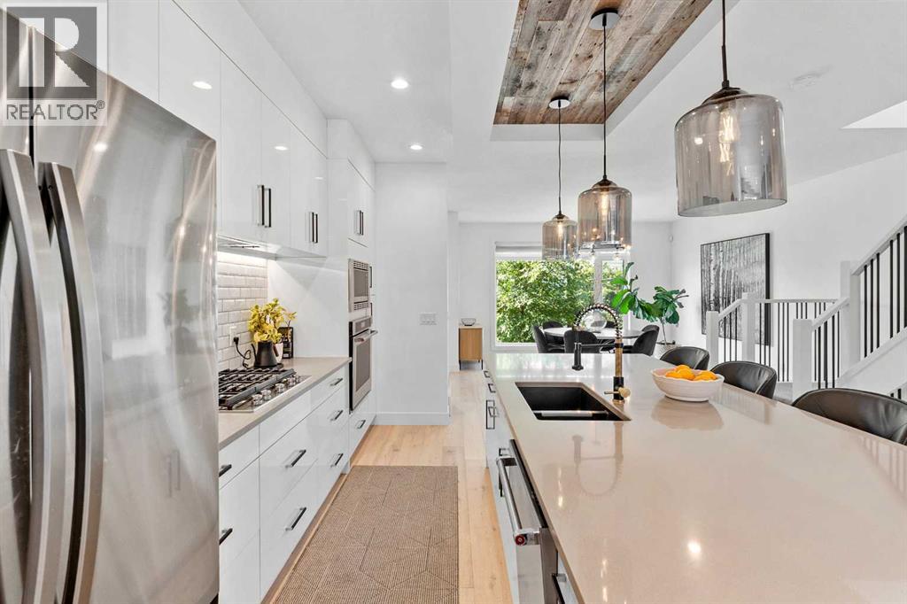 OPEN HOUSE Oct 18 11-1pm. PRICE REDUCED! Fall in love with this, next to new, SEMI-DETACHED home that has only been occupied for 3 years! This modern inspired infill delivers over 2,974 sq ft of developed living space, thoughtfully finished with high-end upgrades and a fully developed basement. Just steps from the Bow River pathways, Shouldice Athletic Park, and an easy hop to Market Mall and downtown, this location perfectly balances active outdoor living with urban convenience.The main floor showcases a chef’s kitchen with 12ft ceiling-height, custom cabinetry, a sleek tile backsplash, designer pendant lights, an oversized island with bar seating, a built-in pantry, and premium stainless-steel appliances—including a gas cooktop, Built in double stove, French-door fridge, custom hood fan, and dishwasher.A spacious living room centers around a striking gas fireplace flanked by custom millwork and opens through lfloor to ceiling sliding patio doors to the backyard. At the front, the generous dining area is framed by oversized windows, while a discreet mudroom with built-in benches and full closets keeps everything organized. A private powder room completes the level.Upstairs, the elegant primary suite impresses with huge windows, and a walk-in closet to die for! This walk in closet is every business person’s dream! It’s a must see! The spa-inspired ensuite features dual under-mount sinks, quartz counters, a soaker tub, and a glass shower with a built-in bench. Two additional bedrooms share a stylish 5-pc bath with dual sinks, and the upper laundry room includes matching quartz counters and a convenient laundry sink.The fully developed basement expands your living space with an open rec room and full wet bar, a versatile flex area—perfect for a home gym or office—a fourth bedroom , and a 3-pc bath. Let's not forget about the 20X20 double detached garage will alley access. There's lots of storage for all your mountain adventures in there! Living in Montgomery mea ns riverside pathways, quick mountain getaways, and easy access to Foothills Hospital, U of C, and downtown Calgary—all right outside your door.Why pay for 2025 prices when you can have this one at a lower price point! (id:54406)