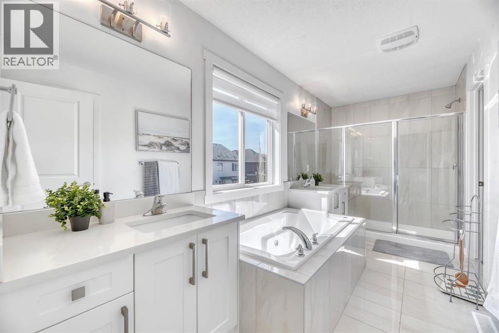 Welcome to this stunning semi-estate home in the highly sought-after community of Legacy—where style, space, and functionality come together to create the perfect family home. From the moment you walk through the front door, you’ll be impressed by the bright, airy feel and exceptional attention to detail throughout this immaculate 2,393 sq ft residence. Flooded with natural light, the main floor offers a spacious and thoughtfully designed layout ideal for both everyday living and entertaining. The chef-inspired kitchen features crisp white cabinetry, quartz countertops, a gas cooktop, built-in wall oven and microwave, and a convenient walk-through pantry that seamlessly connects to the open mudroom/front entry. Very cohesive and large family friendly design! The open-concept living and dining areas create a welcoming space for gatherings, all enhanced by the home’s clean, modern aesthetic. Upstairs, you’ll find an incredible layout with four generously sized bedrooms and a massive central bonus room, perfect for family movie nights or a kids’ retreat. The primary suite is truly a standout—offering an expansive bedroom, a luxurious 5-piece ensuite complete with dual vanities, a jetted soaker tub, and an oversized shower. The walk-in closet conveniently connects through to the laundry room, which includes a wash sink for added functionality.The fully finished basement continues to impress with 9’ ceilings, large windows providing abundant natural light, a spacious recreation area, an additional bedroom, and a 3-piece bathroom. With a separate side entry, this level offers excellent potential for a future mother-in-law or legal suite (subject to municipal approval and permitting).Additional features include central air conditioning, a slightly oversized double attached garage, and a sunny backyard that will soon be surrounded by lush greenery and mature landscaping—perfect for enjoying Calgary’s warmer months. Situated on a quiet street, this home is just steps from the ridge, scenic pathways, skating rink, and the popular Legacy Blue Playground. You’re also conveniently close to schools, shopping, transit, and major roadways for easy commuting. This is your opportunity to create your own Legacy in one of Calgary’s most family-oriented communities. (id:54406)