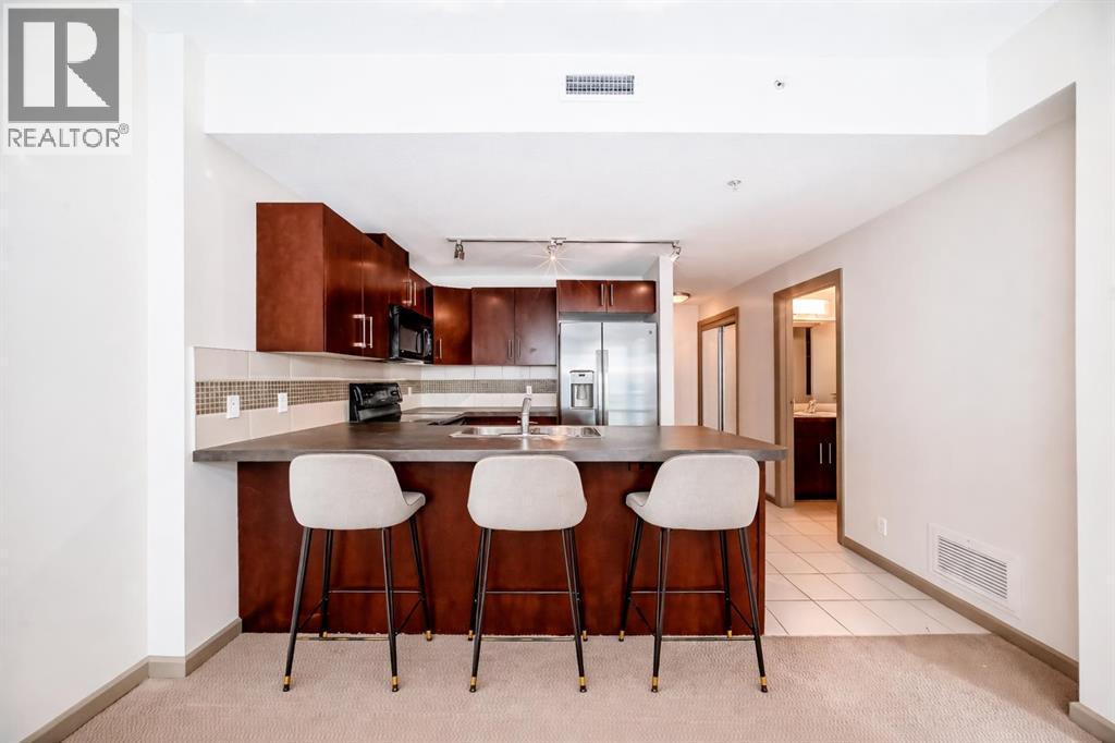 Welcome to this spacious and well-appointed 1-bedroom condo in the sought-after VETRO building, ideally located in the heart of Calgary’s vibrant Beltline. This open-concept unit offers a functional layout with 9-foot ceilings, creating a bright and airy living space perfect for both everyday living and entertaining.The kitchen features ample cabinetry, generous counter space, and a convenient breakfast bar that seamlessly connects to the living and dining areas. The large living room opens onto a private balcony with city views—an ideal spot to relax and enjoy your morning coffee.The bedroom is generously sized with great natural light, while the full bathroom is well maintained and easily accessible from the bedrooms spacious walk through closet. This unit also includes the convenience of in-suite laundry, one underground parking stall, and a separate storage locker.Life at VETRO means having it all—stay active in the fitness centre, relax in the hot tub, entertain in the games room, or enjoy your own private theatre experience. But what truly sets this home apart is its unbeatable location. With the new arena district just steps away and Stampede Park and the BMO Centre moments from your door, you’re perfectly positioned in one of Calgary’s most dynamic and evolving neighbourhoods.Perfect for professionals, first-time buyers, or investors seeking an exceptional inner-city lifestyle. (id:54406)