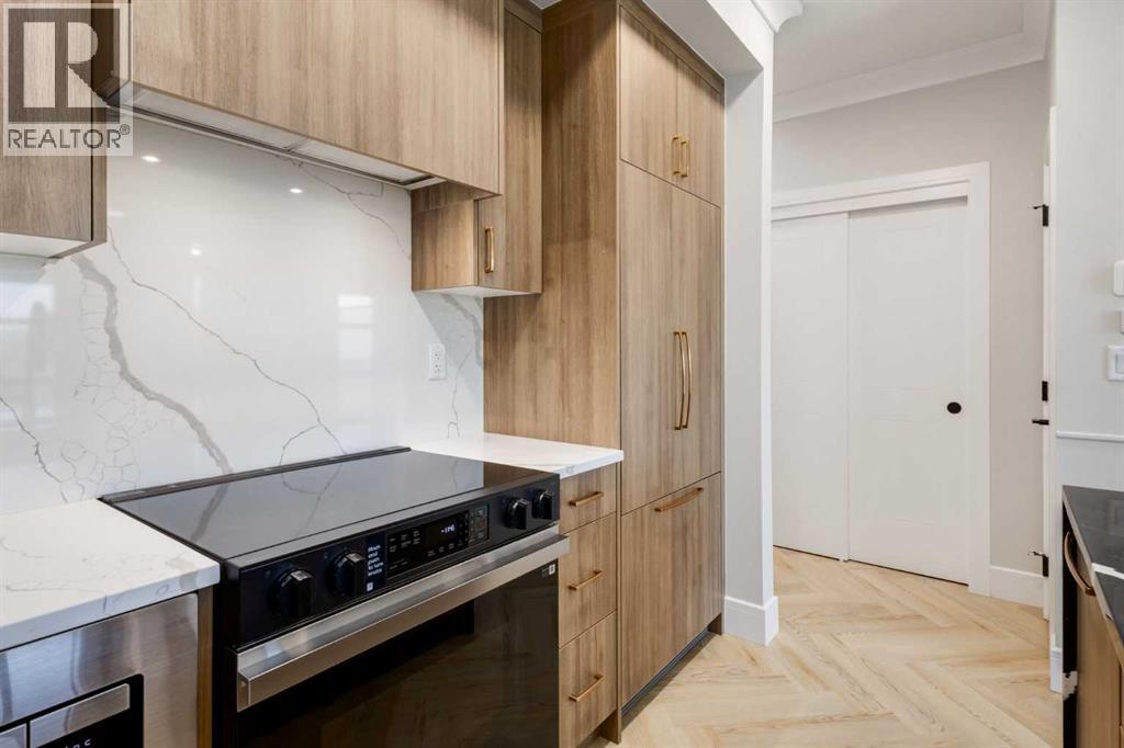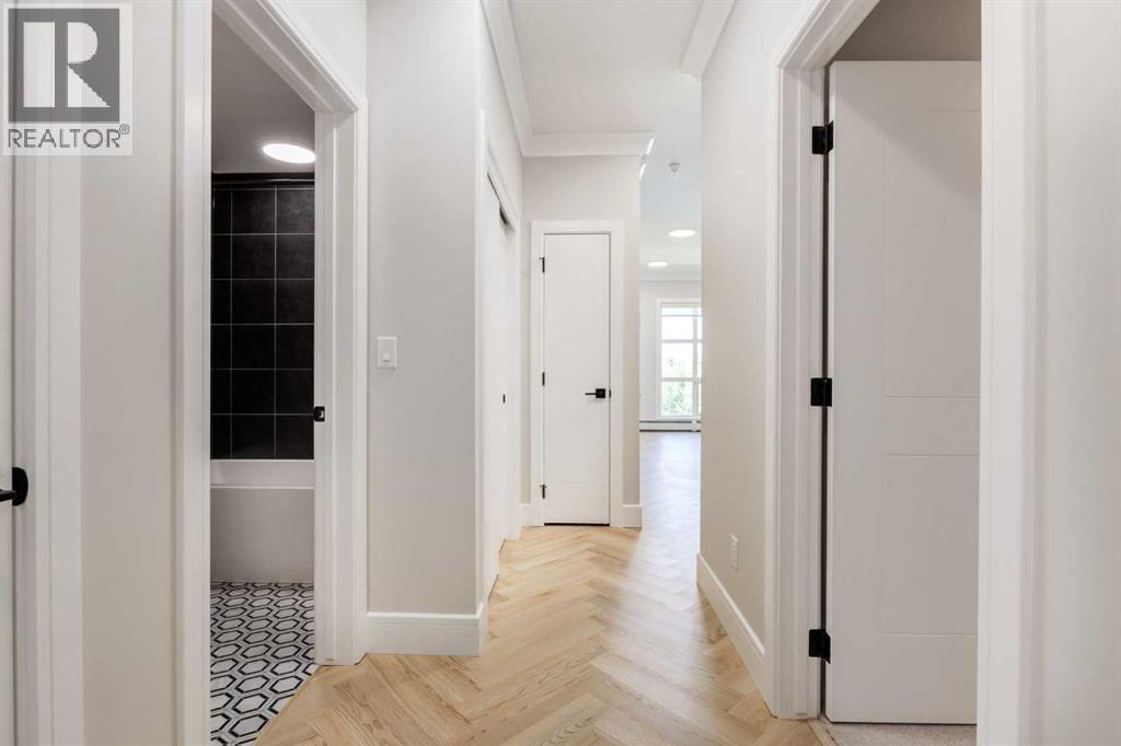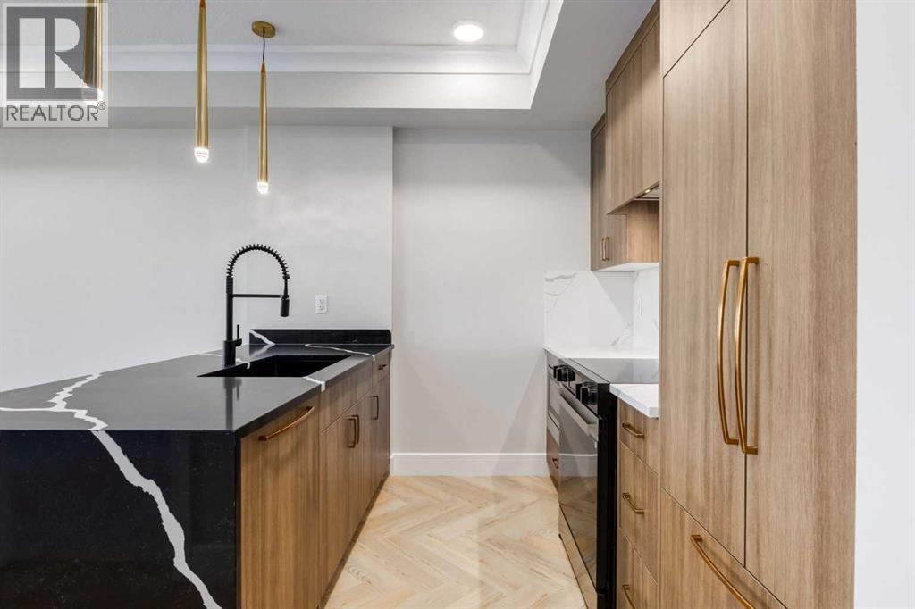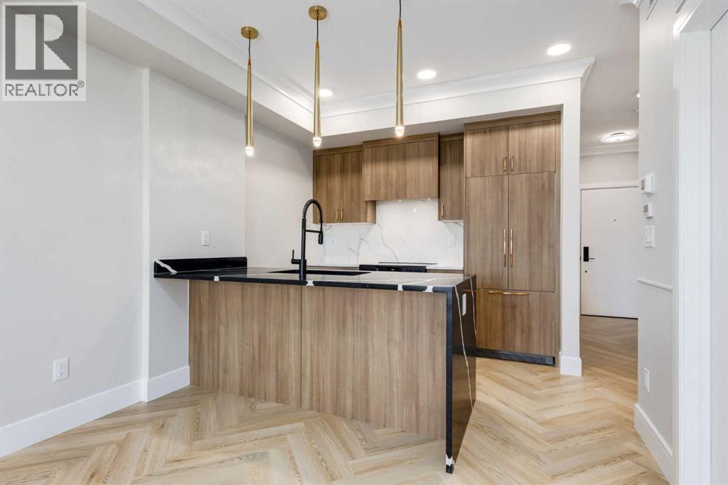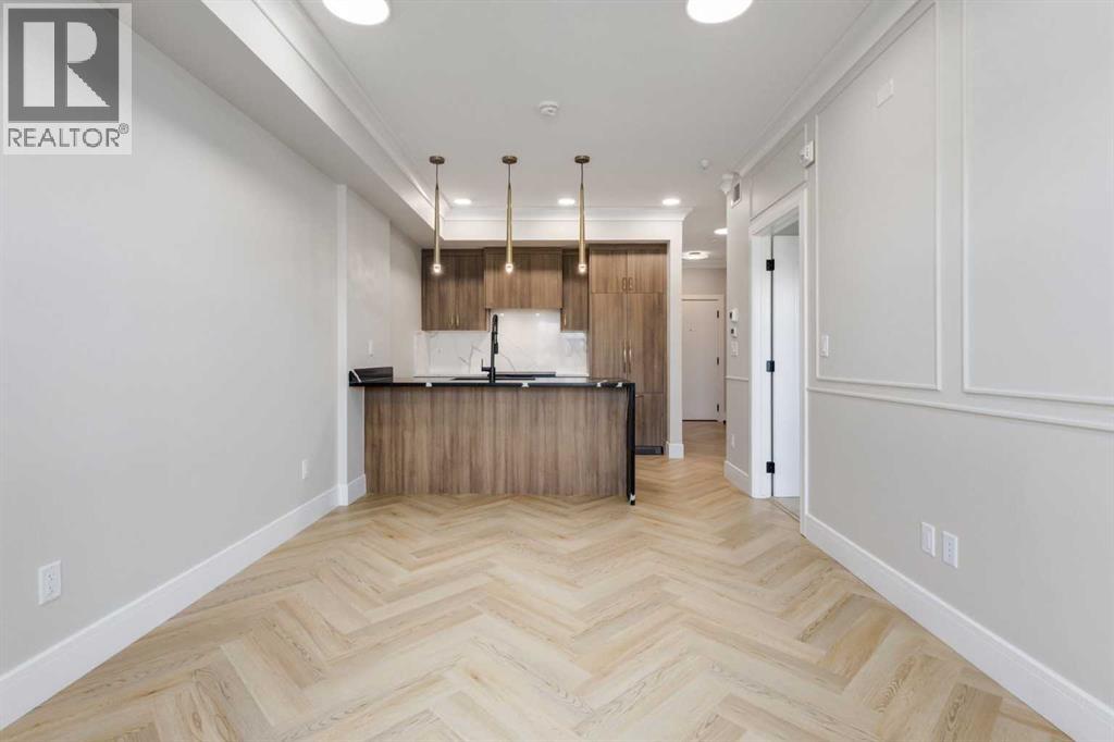 Welcome to the “Verde” floorplan by Rohit Homes—a thoughtfully designed 1-bedroom + den, 1-bathroom residence that perfectly balances comfort and style. Ideally situated on the 5th floor of Quesnay at Currie Barracks, this elevated home offers enhanced privacy along with beautiful natural light and west-facing views.Finished in the timeless Neoclassical Revival color palette, the interior showcases warm, refined tones and elegant detailing that create a sophisticated yet inviting atmosphere. The Verde floorplan is designed with both aesthetics and practicality in mind, featuring 9’ ceilings, quartz countertops with a waterfall edge, a coordinating quartz backsplash, full-height cabinetry, stainless steel appliances, designer light fixtures, and window coverings.The open-concept layout seamlessly connects the kitchen, dining, and living areas, making the space feel bright and expansive—perfect for entertaining or quiet evenings at home. The primary bedroom serves as a relaxing retreat, while the versatile den provides flexibility for a home office, study space, or additional storage. The bathroom offers a spa-inspired feel with fully tiled walls, polished finishes, and a tub/shower combination.Step outside onto your private west-facing balcony to enjoy sunset views and fresh air from your 5th-floor vantage point.This pet-friendly and AIRBNB-friendly building includes titled heated underground parking and ample visitor parking. Located just minutes from downtown, Mount Royal University, and the vibrant amenities of 17th Ave and Marda Loop, the Verde floorplan offers exceptional urban convenience paired with refined design.Don’t miss your opportunity to own this beautifully finished 5th-floor home.**Photos are taken from existing buildings of the same models and are not of the exact unit.** (id:54406)