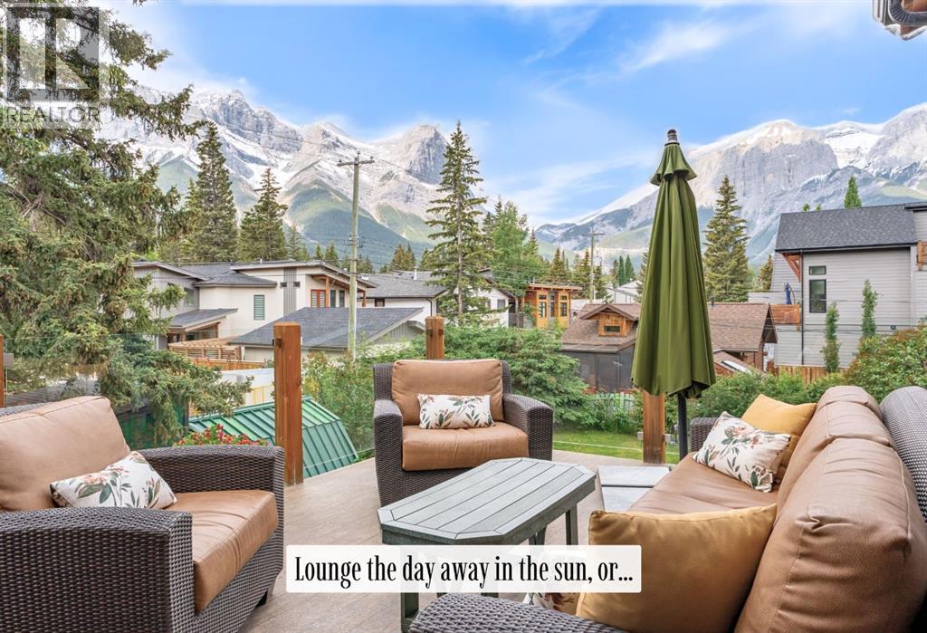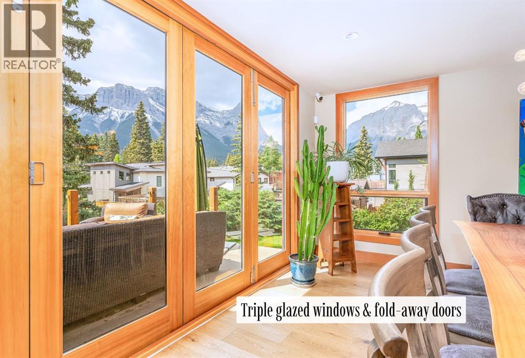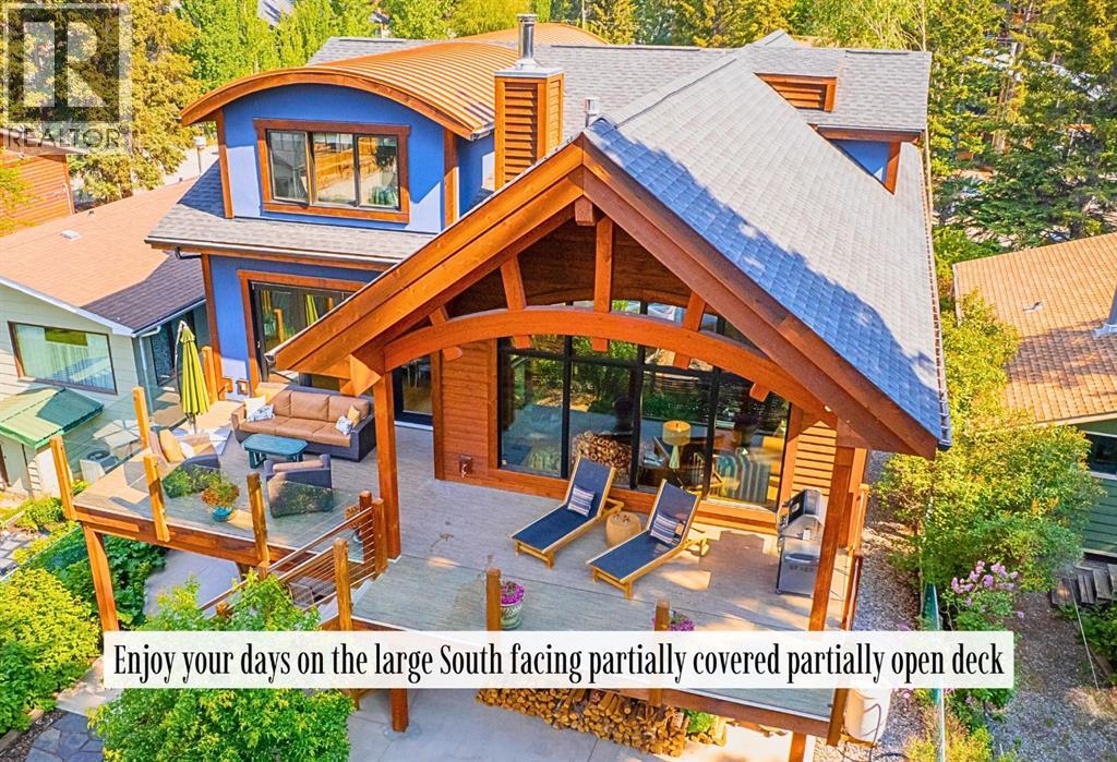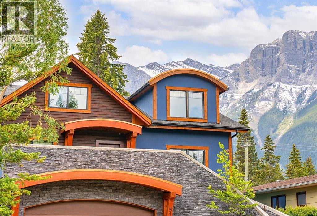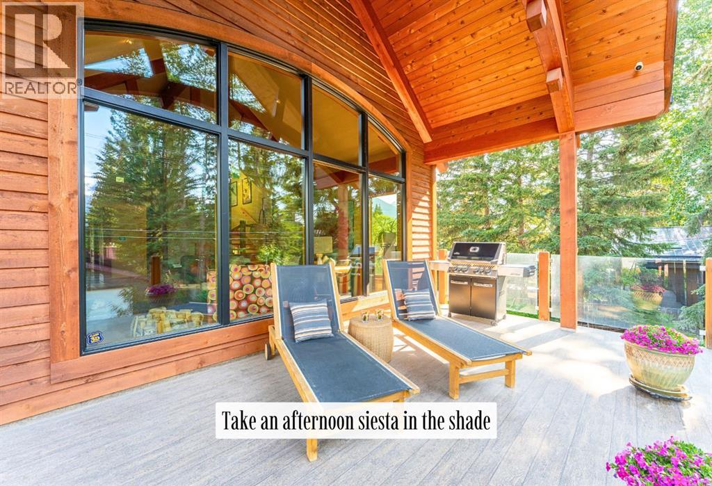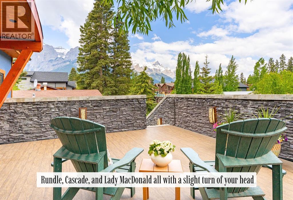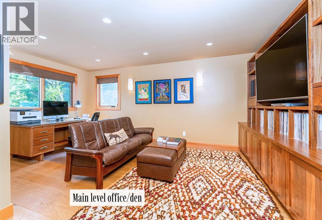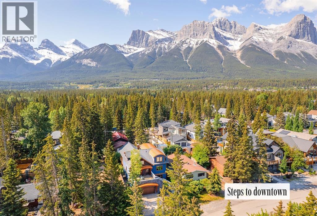 Welcome to an exceptional luxury home in the heart of South Canmore, where mountain living meets refined design in the most coveted neighbourhood in town. Framed by sweeping alpine vistas and set on quiet 4th Street, this remarkable 5-bedroom + office, 5-bathroom residence was thoughtfully designed as a forever home, perfectly balancing timeless architecture and generational functionality.From the moment you arrive, the home’s distinctive curved post-and-beam architecture makes a lasting impression. Graceful arcing rooflines echo the surrounding peaks, while the rich wood detailing creates a sense of warmth and permanence. Every line feels intentional, every space designed to evolve with you and your family through every stage of life.On the main floor, a serene bedroom with a full ensuite offers the ease of one-level living, ideal for guests or future accessibility. A built-in elevator connects every floor effortlessly—perfect for post-surgery recovery, limited mobility, or simply carrying groceries with ease. At the front of the home, a professional office provides a polished and private space to meet with clients, bathed in natural light and framed by peaceful neighbourhood views.The heart of the home unfolds in the breathtaking great room. A dramatic floor-to-ceiling wood-burning fireplace anchors the space, inviting cozy evenings as snow falls softly outside. Vaulted ceilings soar overhead, accentuated by curved timber beams that draw your eye upward—and outward—to the iconic Three Sisters. Walls of glass blur the boundary between indoors and out, filling the room with sunlight and ever-changing mountain moods.Step outside to spectacular outdoor living. The expansive south-facing deck is designed for every season: partially covered for year-round comfort, partially open for sun-soaked afternoons, stargazing nights, and front-row seats to the northern lights. Unobstructed views of Ha Ling Peak rise boldly before you, creating a backdrop that feels both d ramatic and deeply calming.Downstairs, the second living room is bright and welcoming, with high ceilings and a wall of windows looking out over the charming fenced yard where mature and younger trees create layered privacy. Get used to gathering around the firepit under a canopy of stars, or enjoy quiet mornings surrounded by birdsongs. The large front deck captures warm afternoon and evening sun, offering sweeping views across the valley to the Cascade and Lady McDonald ranges—an ever-changing landscape of light, shadow, and alpen glow.The luxury kitchen blends striking aesthetics with intelligent design. High-end (Wolf & Sub Zero) appliances, premium finishes, and thoughtful storage make it as functional as it is beautiful. The partially open-concept layout keeps conversations flowing between the kitchen, generous eating bar, and spacious dining room—perfect for lively gatherings, holiday dinners, or intimate family meals.Adding to the home’s versatility is the option https://youtu.be/ev5eKVHPU5o (id:54406)