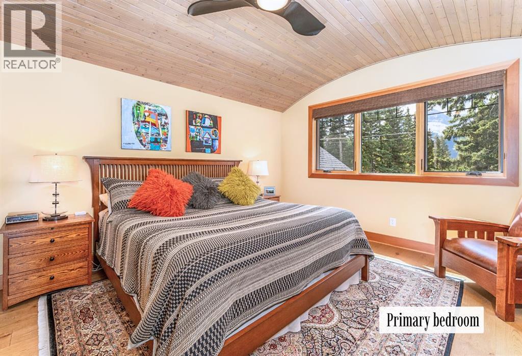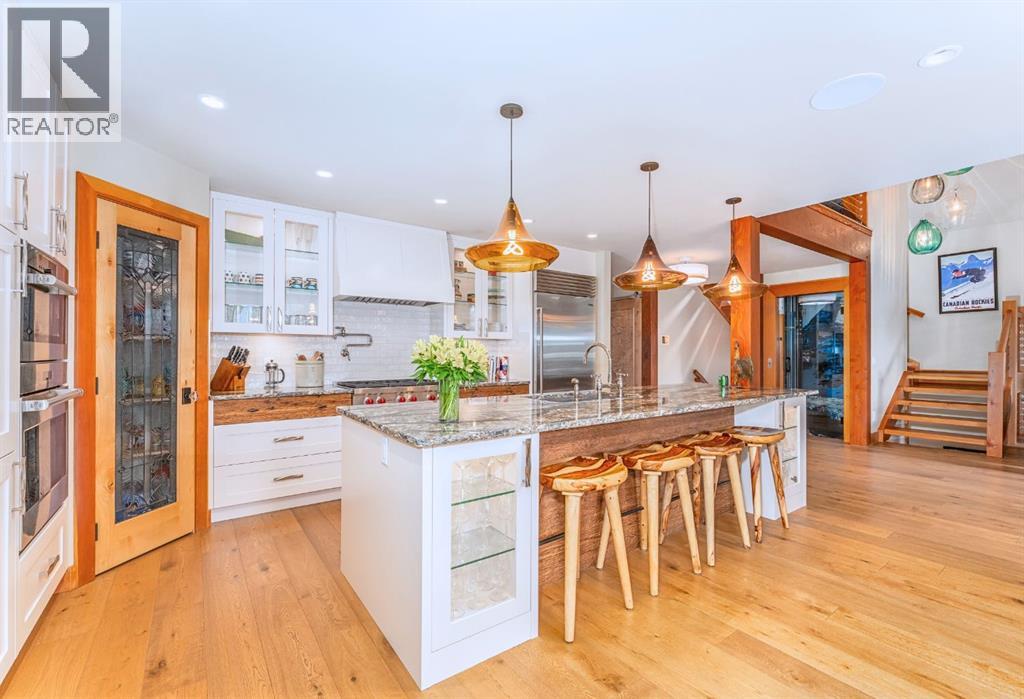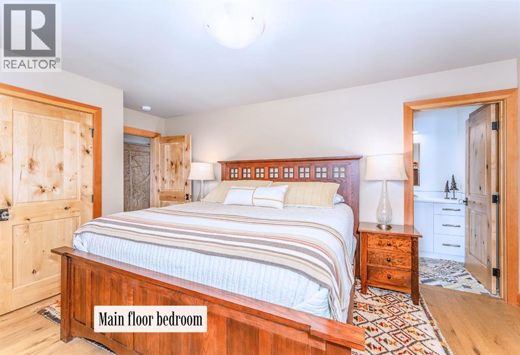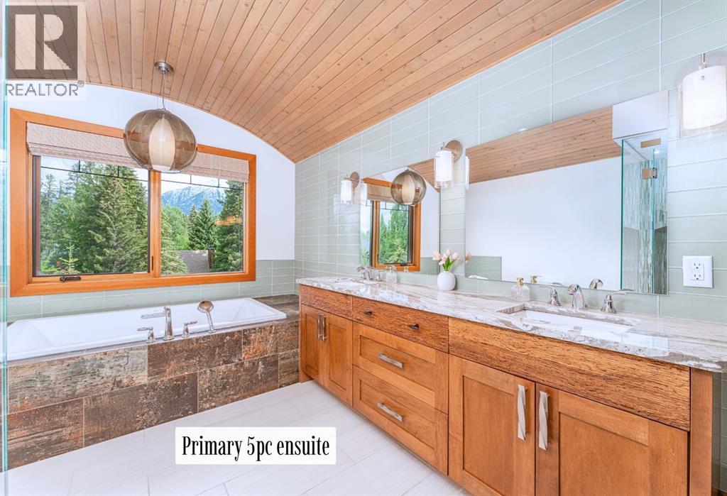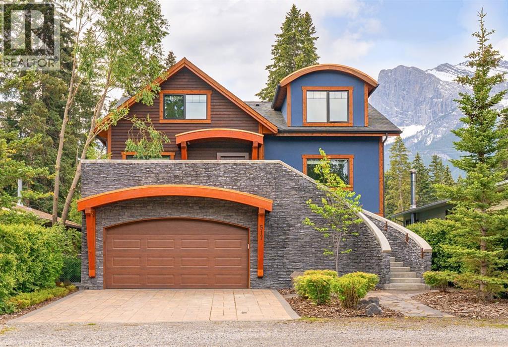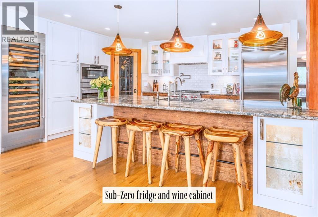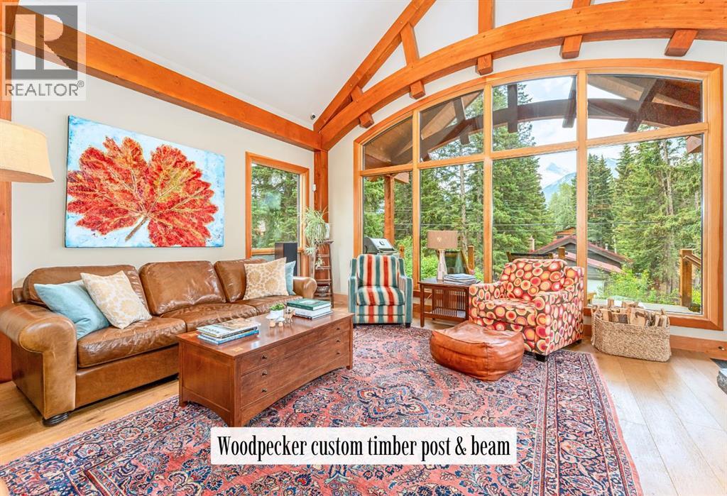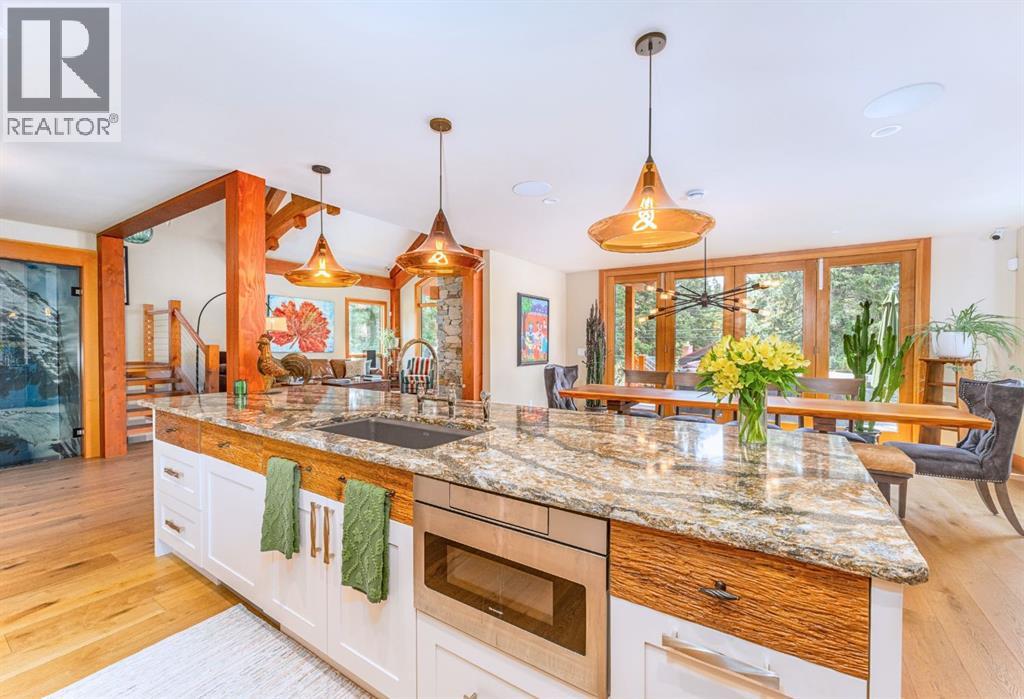 Welcome to an exceptional luxury home in the heart of South Canmore, where mountain living meets refined design in the most coveted neighbourhood in town. Framed by sweeping alpine vistas and set on quiet 4th Street, this remarkable 5-bedroom + office, 5-bathroom residence was thoughtfully designed as a forever home, perfectly balancing timeless architecture and generational functionality.From the moment you arrive, the home’s distinctive curved post-and-beam architecture makes a lasting impression. Graceful arcing rooflines echo the surrounding peaks, while the rich wood detailing creates a sense of warmth and permanence. Every line feels intentional, every space designed to evolve with you and your family through every stage of life.On the main floor, a serene bedroom with a full ensuite offers the ease of one-level living, ideal for guests or future accessibility. A built-in elevator connects every floor effortlessly—perfect for post-surgery recovery, limited mobility, or simply carrying groceries with ease. At the front of the home, a professional office provides a polished and private space to meet with clients, bathed in natural light and framed by peaceful neighbourhood views.The heart of the home unfolds in the breathtaking great room. A dramatic floor-to-ceiling wood-burning fireplace anchors the space, inviting cozy evenings as snow falls softly outside. Vaulted ceilings soar overhead, accentuated by curved timber beams that draw your eye upward—and outward—to the iconic Three Sisters. Walls of glass blur the boundary between indoors and out, filling the room with sunlight and ever-changing mountain moods.Step outside to spectacular outdoor living. The expansive south-facing deck is designed for every season: partially covered for year-round comfort, partially open for sun-soaked afternoons, stargazing nights, and front-row seats to the northern lights. Unobstructed views of Ha Ling Peak rise boldly before you, creating a backdrop that feels both d ramatic and deeply calming.Downstairs, the second living room is bright and welcoming, with high ceilings and a wall of windows looking out over the charming fenced yard where mature and younger trees create layered privacy. Get used to gathering around the firepit under a canopy of stars, or enjoy quiet mornings surrounded by birdsongs. The large front deck captures warm afternoon and evening sun, offering sweeping views across the valley to the Cascade and Lady McDonald ranges—an ever-changing landscape of light, shadow, and alpen glow.The luxury kitchen blends striking aesthetics with intelligent design. High-end (Wolf & Sub Zero) appliances, premium finishes, and thoughtful storage make it as functional as it is beautiful. The partially open-concept layout keeps conversations flowing between the kitchen, generous eating bar, and spacious dining room—perfect for lively gatherings, holiday dinners, or intimate family meals.Adding to the home’s versatility is the option https://youtu.be/ev5eKVHPU5o (id:54406)