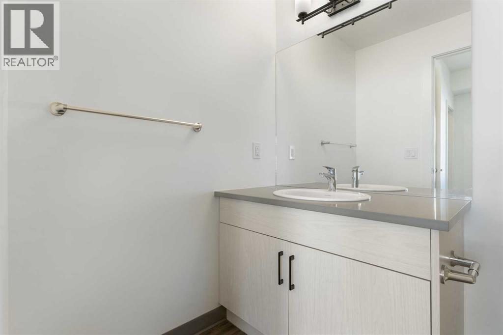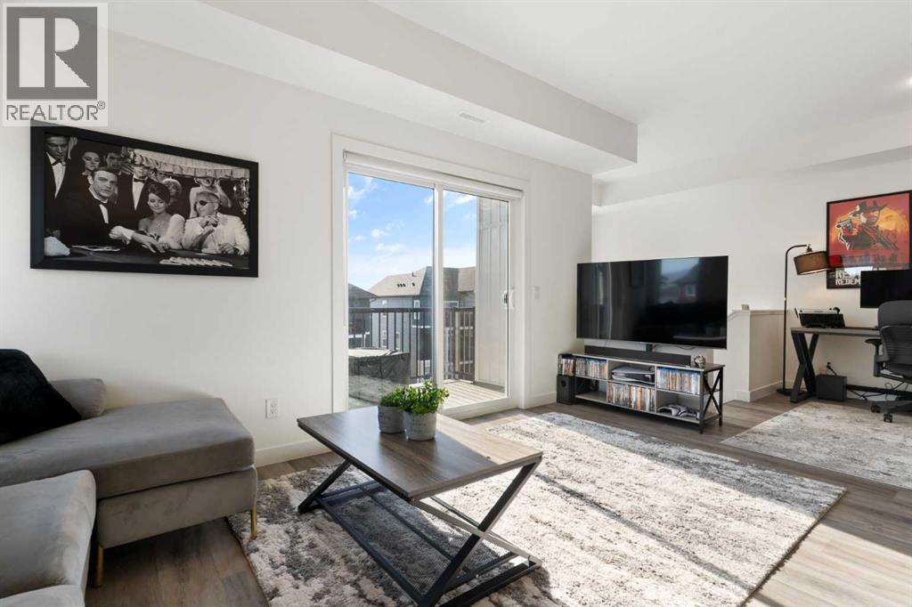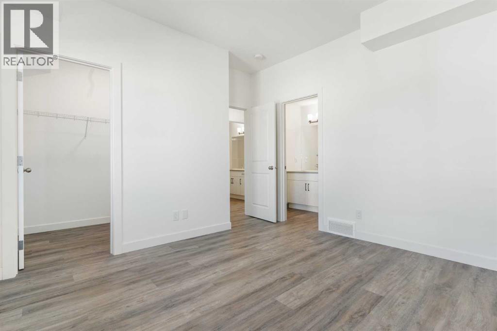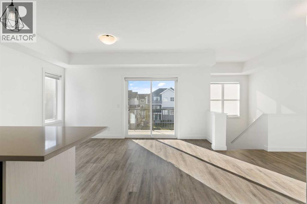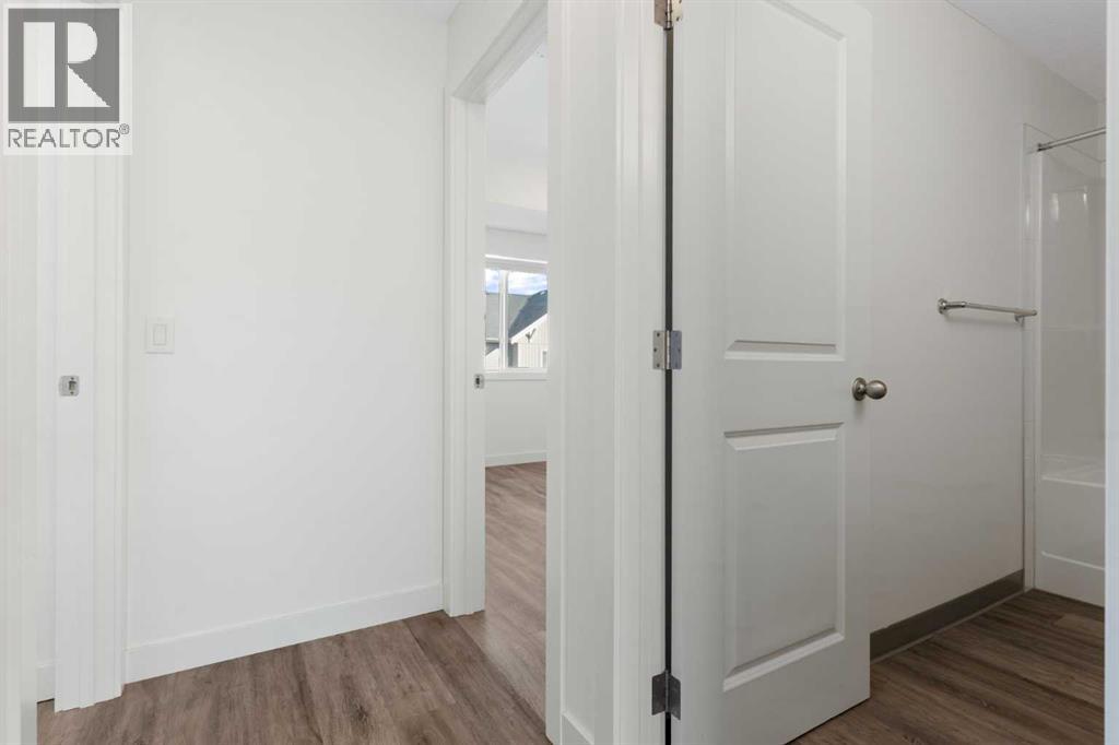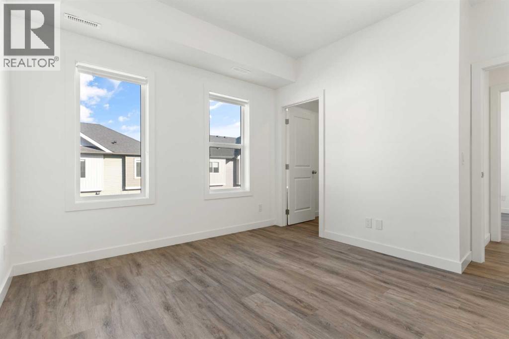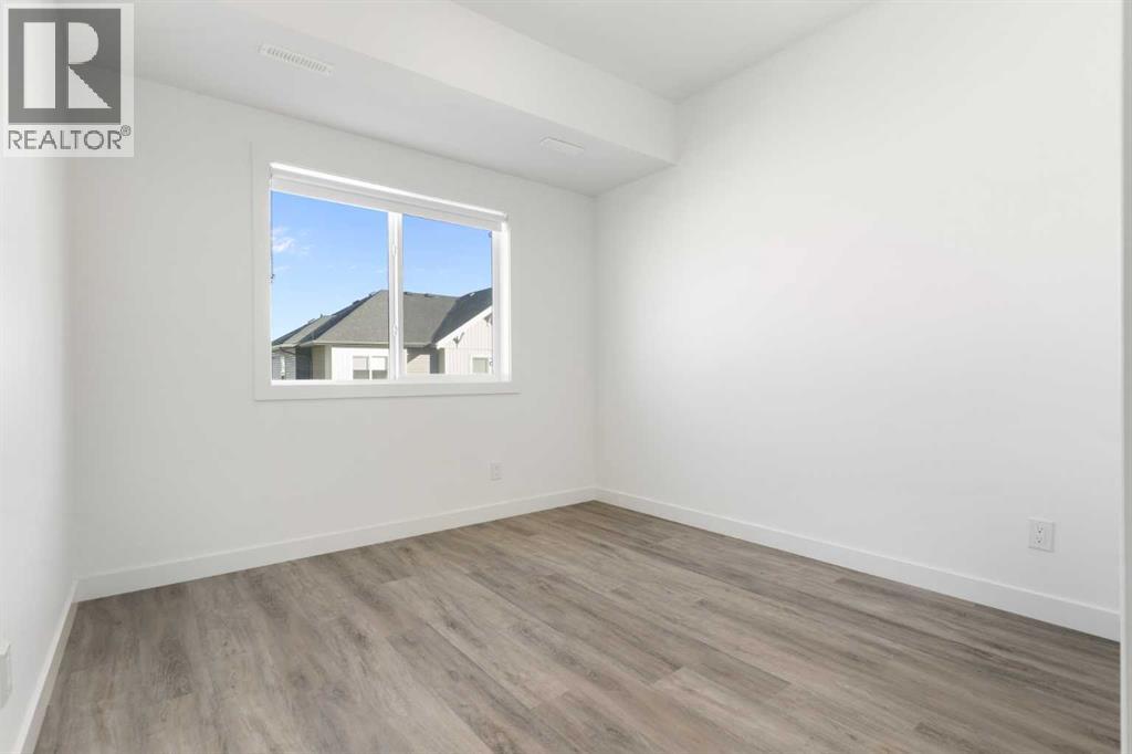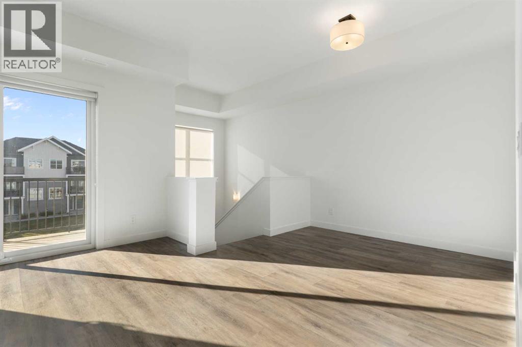 Welcome to The Jasper, a stunning top-floor stacked townhouse that offers the perfect blend of style and function. This unit features over 1250 sq ft of thoughtfully designed living space, with most of the layout conveniently situated on a single level. Step inside and up to the main floor and you will discover an open-concept living area with a full kitchen that's a home chef's dream. The kitchen boasts elegant quartz countertops, soft-close drawers, and stylish two-tone cabinets highlighted by pendant lighting. An adjacent, flexible space is perfect for a spacious dining area or a home office. This home has two large bedrooms and two full bathrooms. The primary bedroom is a true retreat, featuring a massive walk-in closet and a luxurious 4-piece ensuite. A spacious laundry room adds to the convenience.This unique floorplan is designed to feel like a modern apartment but with the added benefits of a main floor storage/flex area and direct access to an oversized, extended single-car garage.This home is perfectly situated to offer the best of both convenience and community. It's located right next to a future school site, with transit options directly at your doorstep for effortless commuting. Enjoy a short two-minute walk to Bow Valley High School, and a quick five-minute trip to the Spray Lakes Sports Centre for all your recreational needs. For bigger city amenities, you're only 20 minutes from South Calgary, and the mountains are within easy reach, with Canmore just a 40-minute drive away. (id:54406)
