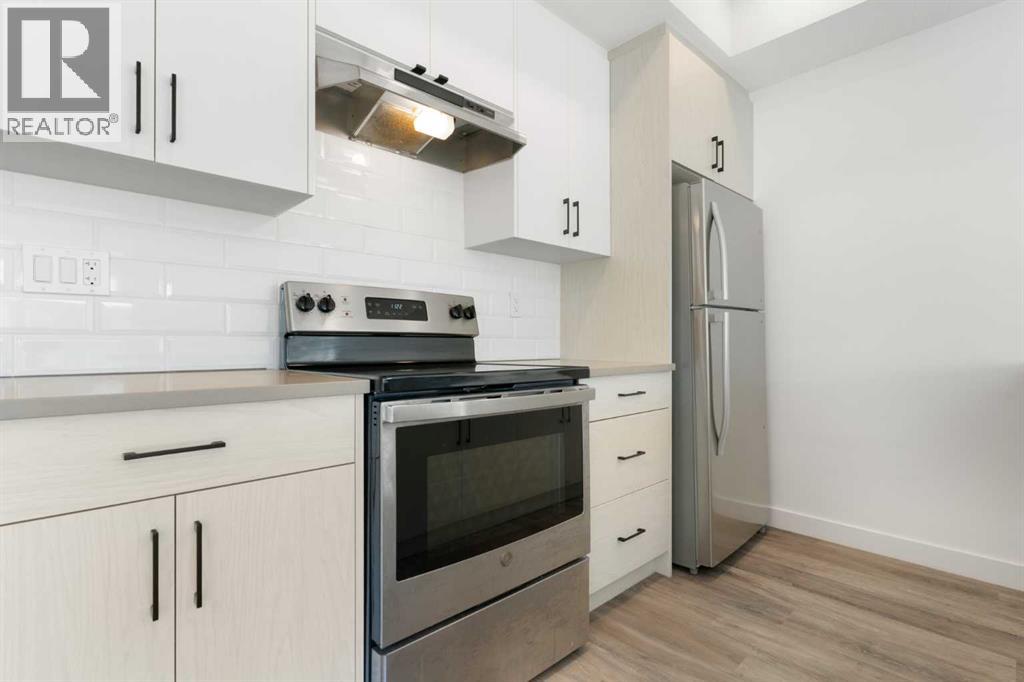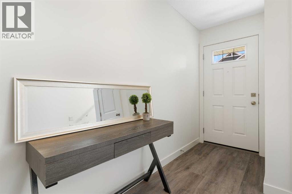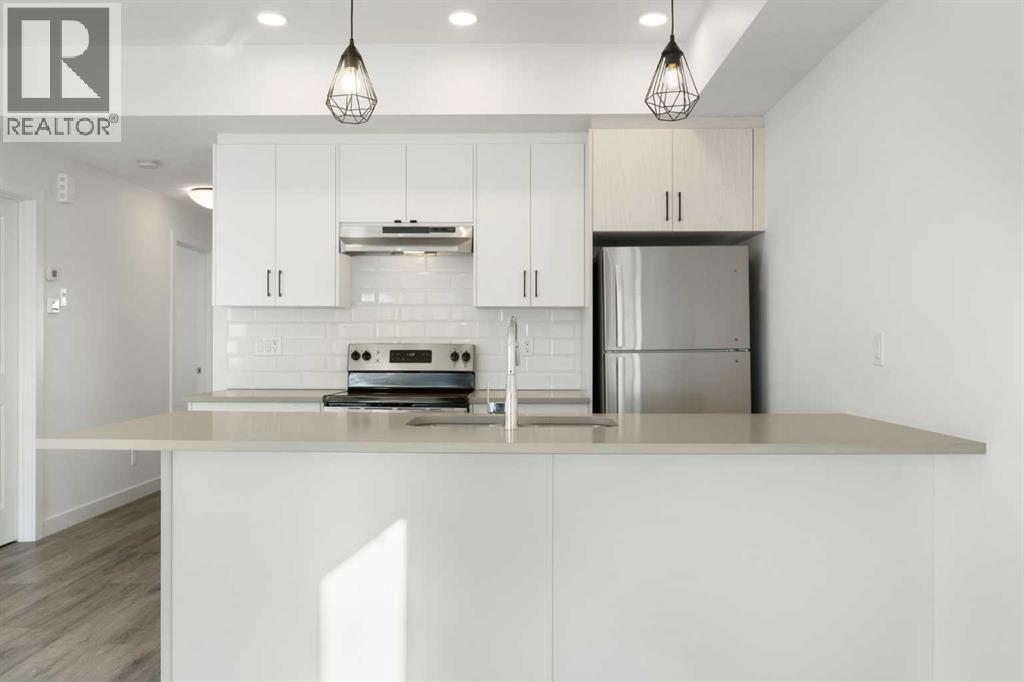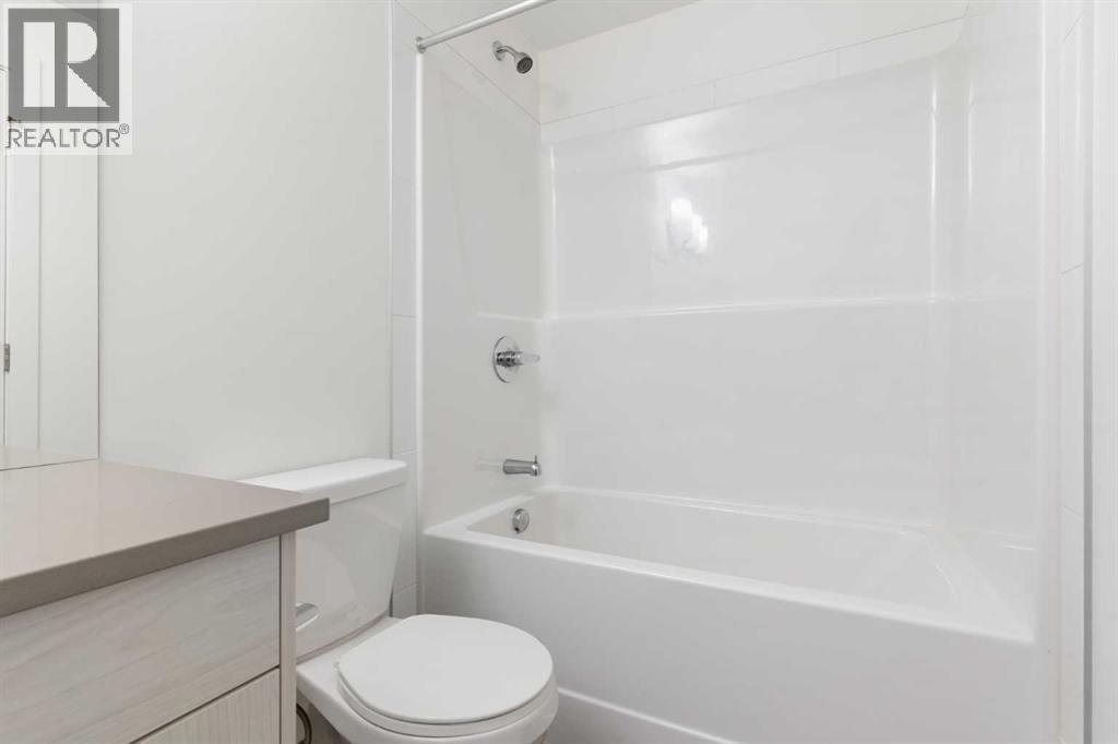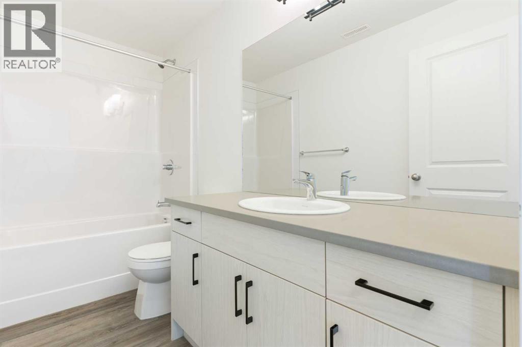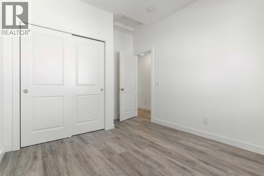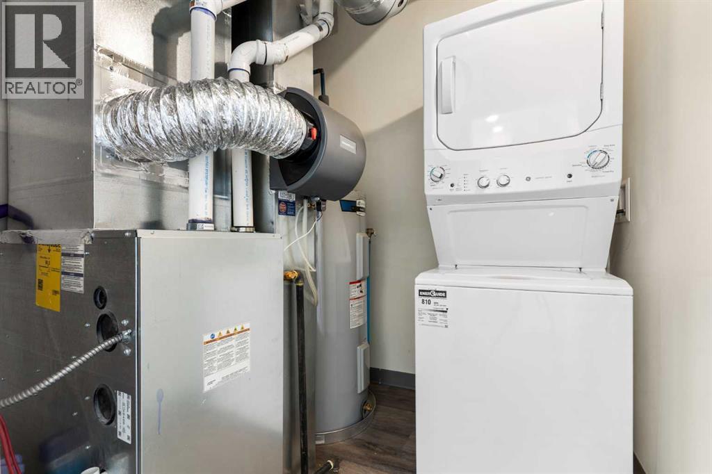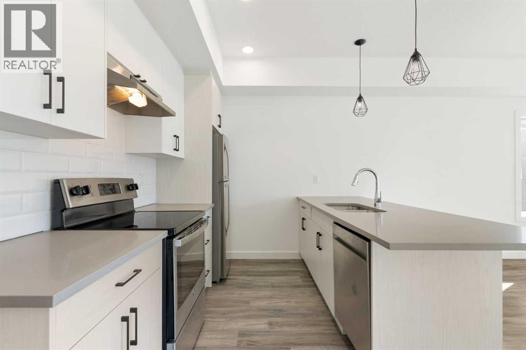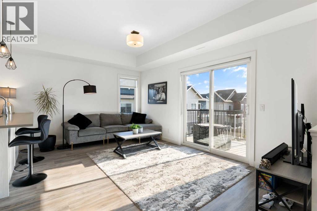Welcome to The Jasper, a stunning top-floor stacked townhouse that offers the perfect blend of style and function. This unit features over 1250 sq ft of thoughtfully designed living space, with most of the layout conveniently situated on a single level. Step inside and up to the main floor and you will discover an open-concept living area with a full kitchen that's a home chef's dream. The kitchen boasts elegant quartz countertops, soft-close drawers, and stylish two-tone cabinets highlighted by pendant lighting. An adjacent, flexible space is perfect for a spacious dining area or a home office. This home has two large bedrooms and two full bathrooms. The primary bedroom is a true retreat, featuring a massive walk-in closet and a luxurious 4-piece ensuite. A spacious laundry room adds to the convenience.This unique floorplan is designed to feel like a modern apartment but with the added benefits of a main floor storage/flex area and direct access to an oversized, extended single-car garage.This home is perfectly situated to offer the best of both convenience and community. It's located right next to a future school site, with transit options directly at your doorstep for effortless commuting. Enjoy a short two-minute walk to Bow Valley High School, and a quick five-minute trip to the Spray Lakes Sports Centre for all your recreational needs. For bigger city amenities, you're only 20 minutes from South Calgary, and the mountains are within easy reach, with Canmore just a 40-minute drive away. (id:54406)
